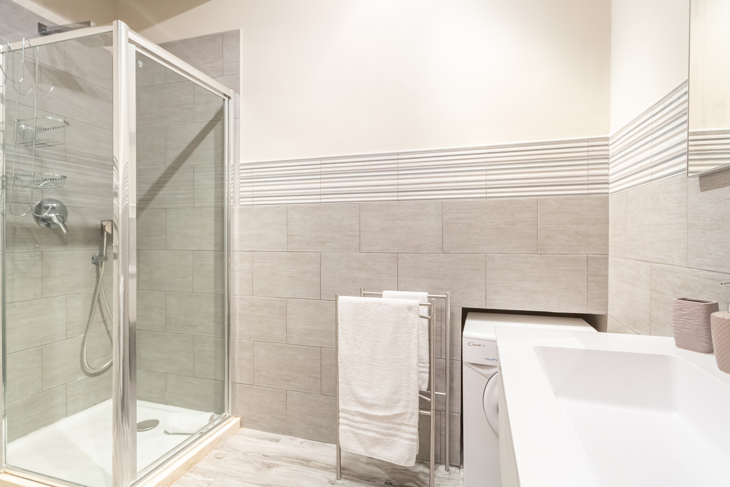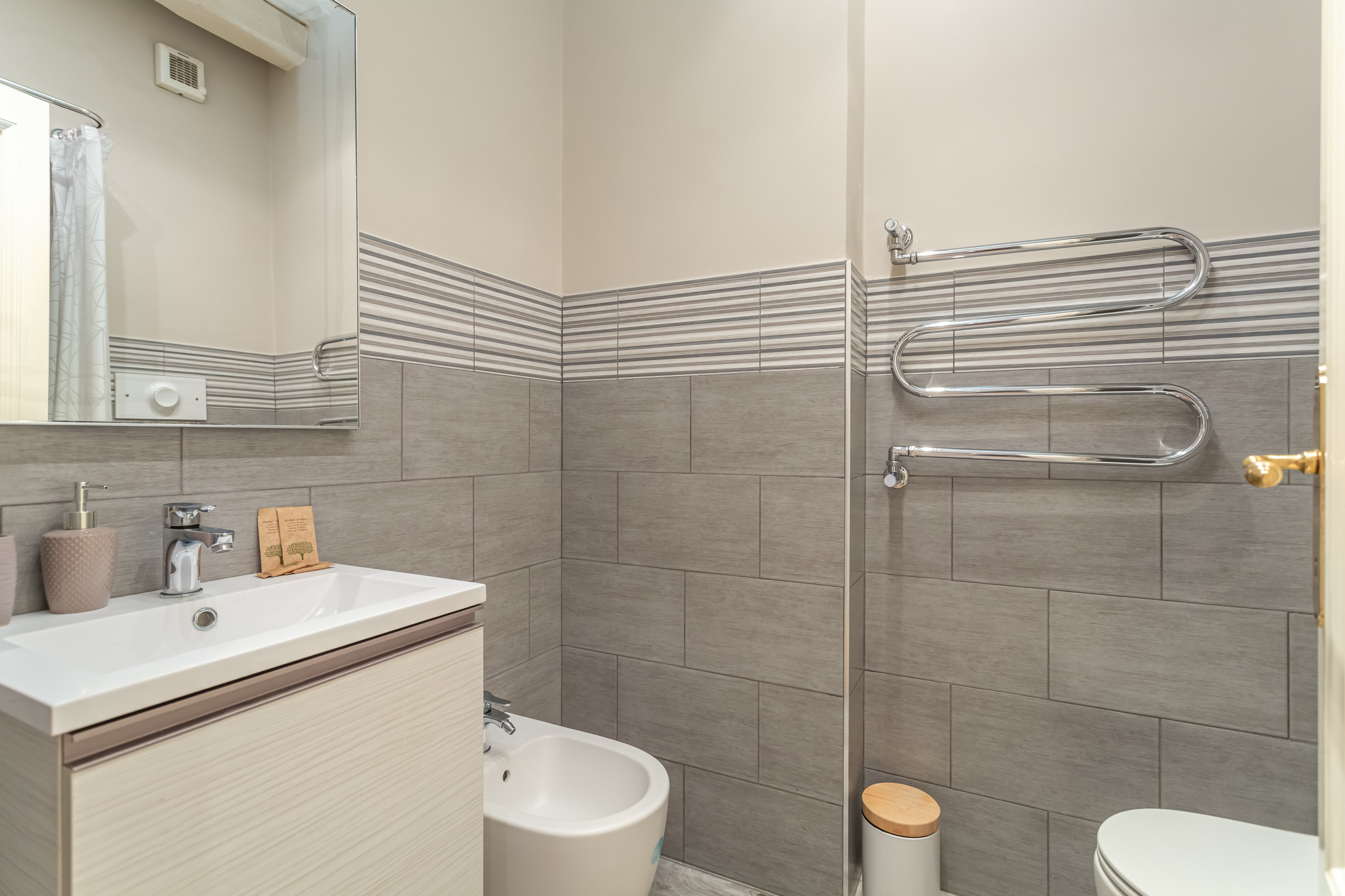 A second bathroom, located near the living area, is ideal for guests using the sofa bed. It is complete with a shower, sink, toilet, and bidet, providing comfort and privacy for everyone staying in the apartment.