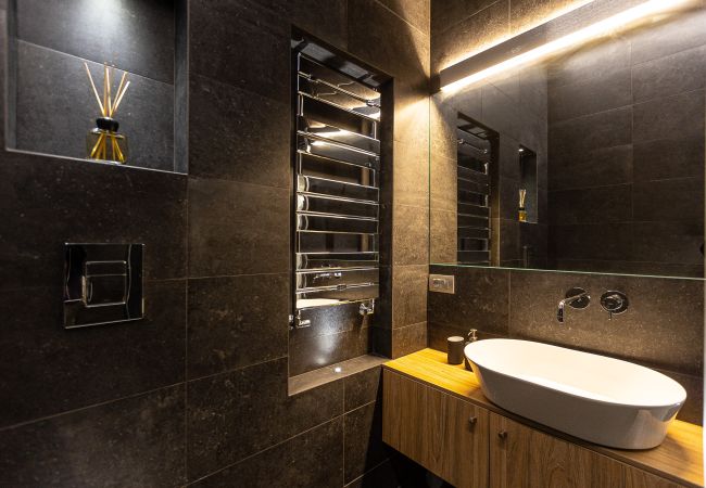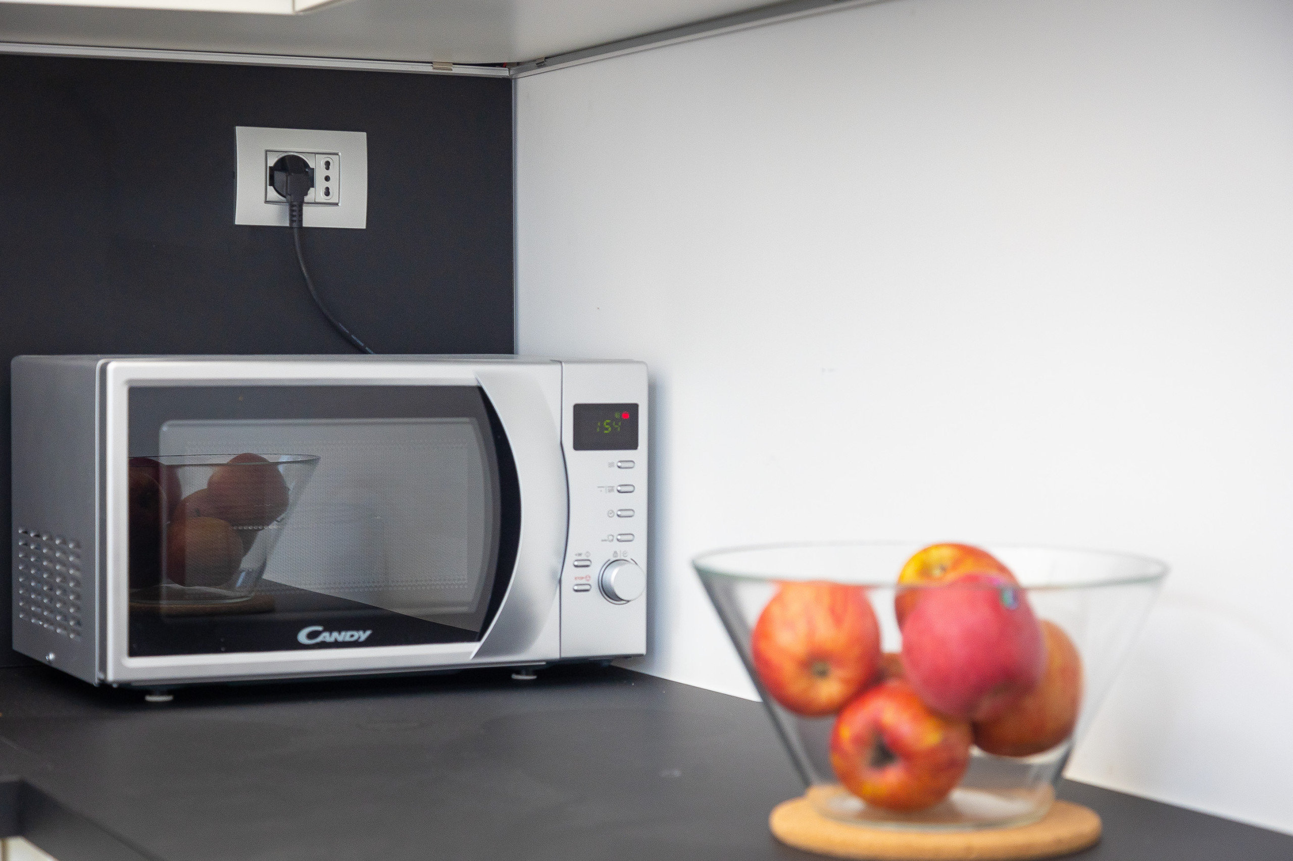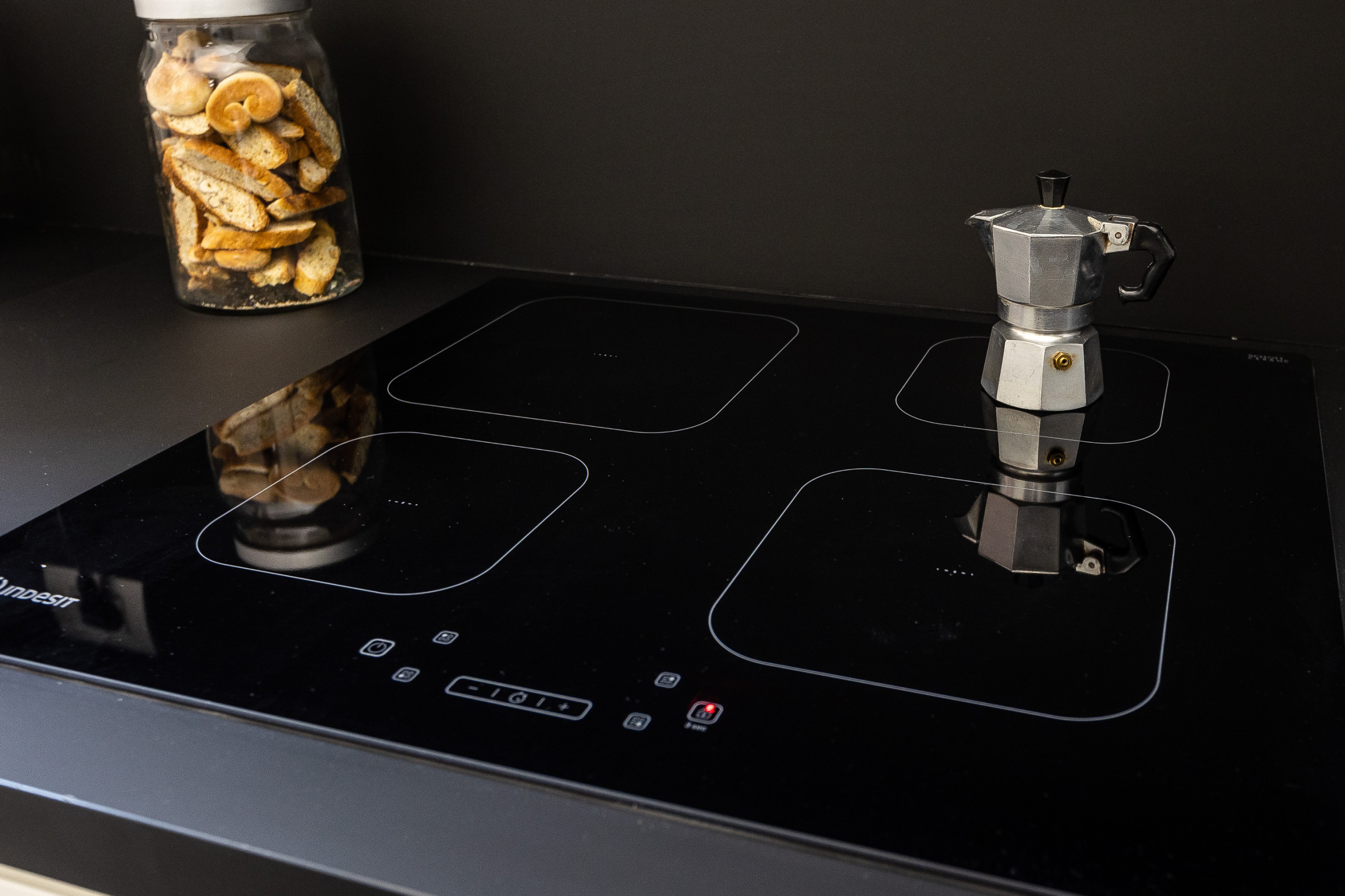 Cocina totalmente equipada con electrodomésticos de última generación: horno, vitrocerámica de inducción, lavavajillas, microondas, cafetera Nespresso, tetera y tostadora.
