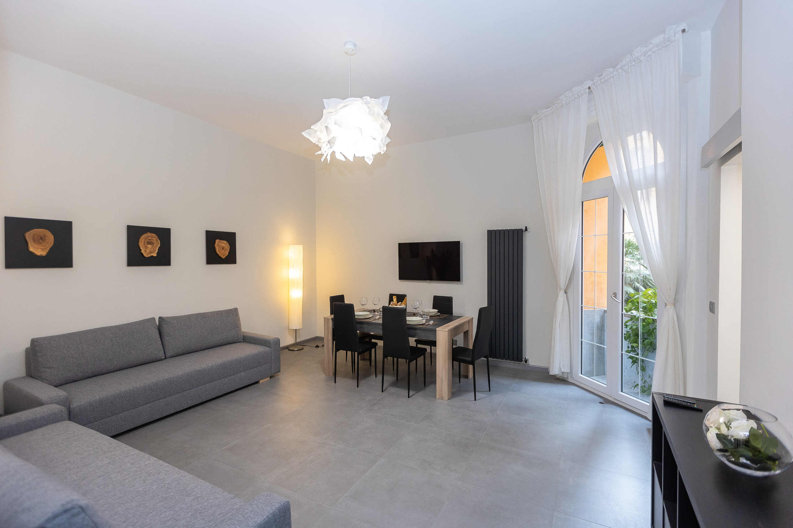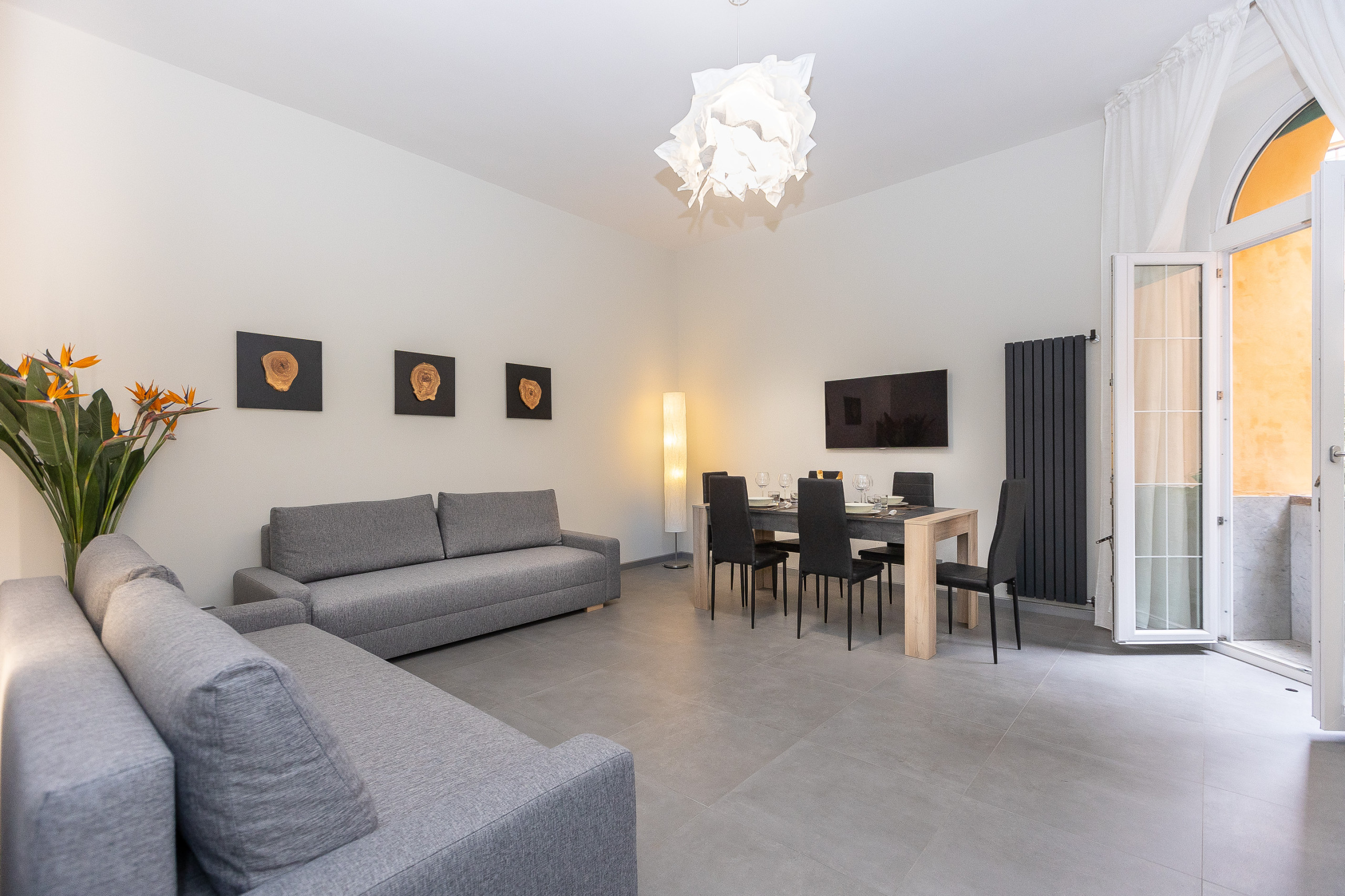 Amplia sala de estar de concepto abierto que combina la cocina, la sala de estar y el comedor en una sola gran sala con vista a la cúpula de San Pedro. Confortable sofá cama frente a smart tv de pantalla plana.